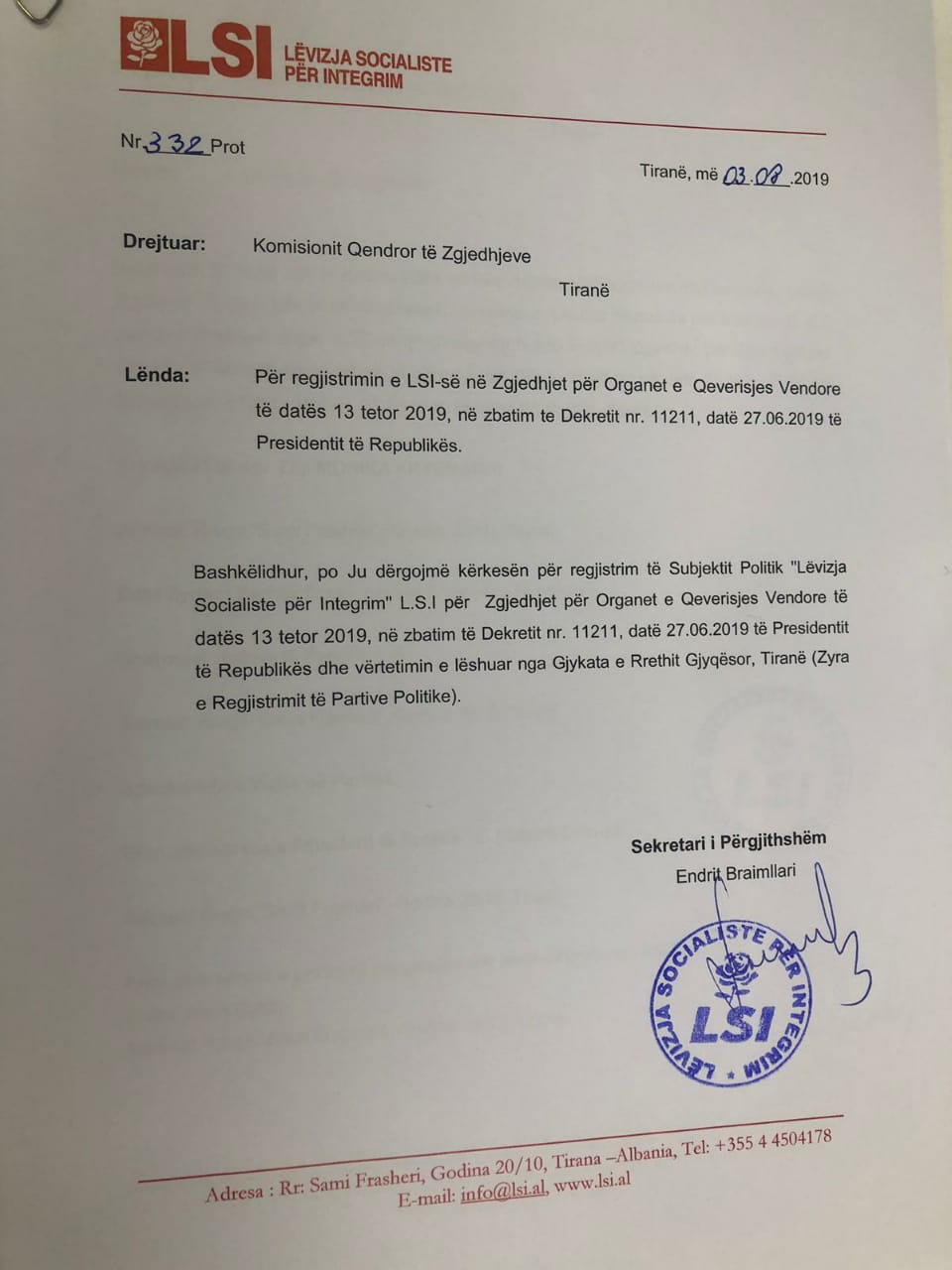 Lëvizja Socialiste për Integrim dorëzon në KQZ kërkesën për regjistrimin në zgjedhjet vendore të 13 tetorit të dekretuar nga Presidenti Ilir Meta.