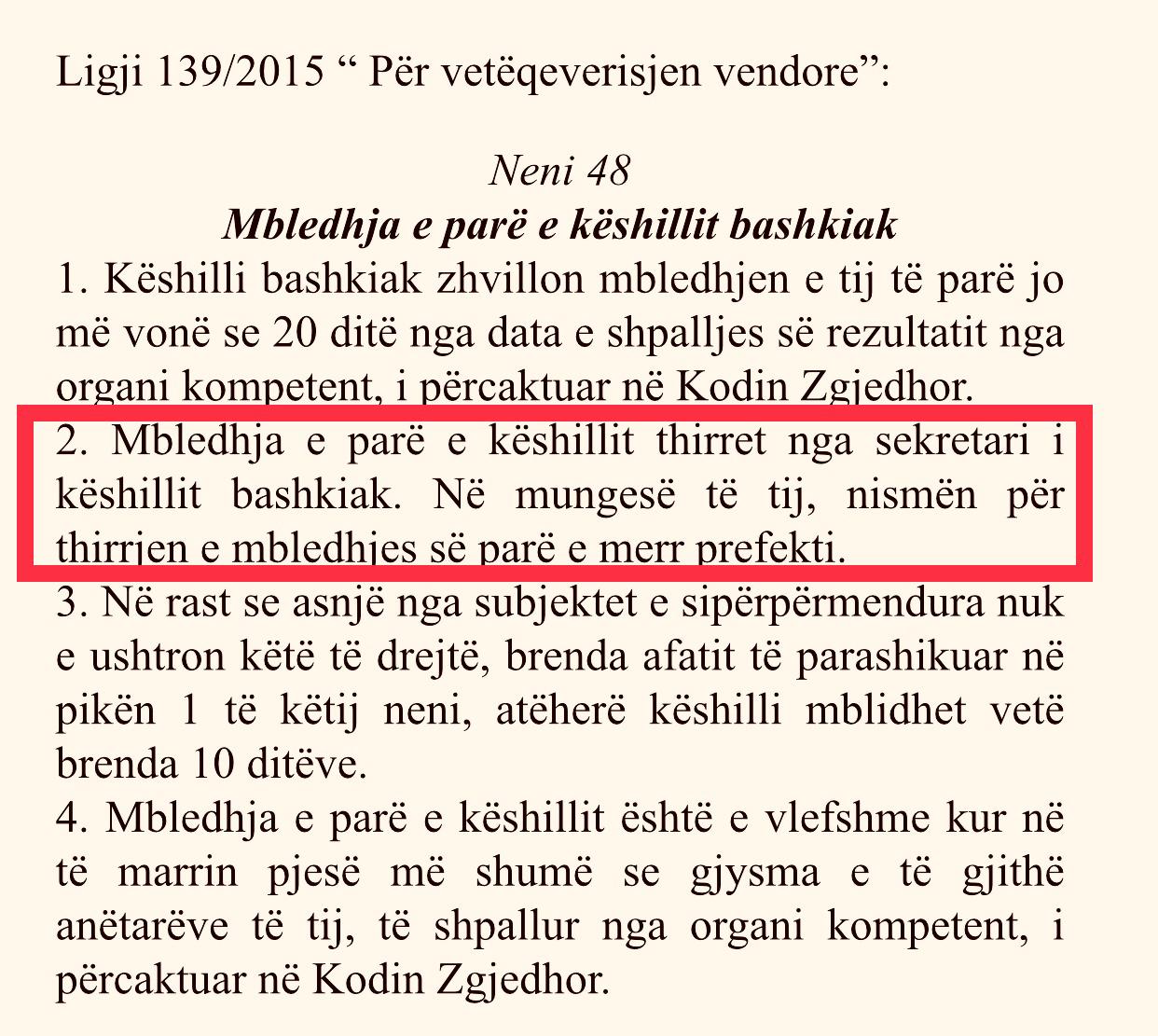 Këshilli Bashkiak i Kamzës ishte thirrur për konstituim në datën 14 Gusht nga Sekretari aktual i Këshillit, por, në shkelje flagrante të ligjit, Prefektja e Tiranës ka vendosur që e njëjta mbledhje të bëhet nesër, sepse Edi Ramës nuk i pritet që të pushtojë Bashkinë e Kamzës.Ligji i pushtetit lokal ia jep këtë kompetencë sekretarit aktual, por, megjithëse ai e ka ushtruar atë rregullisht, duke thirrur konstituimin e Këshillit Bashkiak të Kamzës brenda afatit, përfaqësuesja e Edi Ramës ka vendosur të cenojë autonominë e pushtetit lokal dhe të uzurpojë kompetencën e sekretarit të këshillit bashkiak”, deklaroi Spaho.