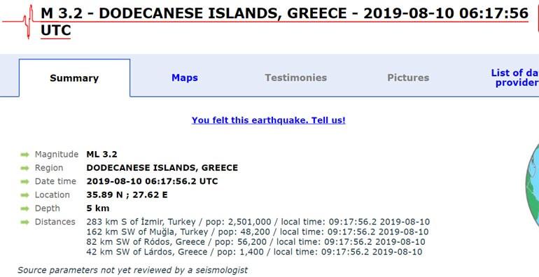 Instituti Gjeodezik i Observatorit të Athinës jep të dhënat e tërmetit në 3.5 Rihter, me një thellësi fokale prej 10 kilometrash dhe një fokus prej 38 km në jug të Halki.