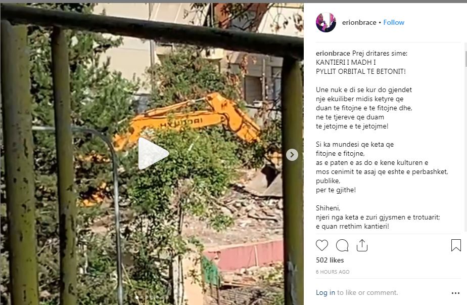 Erjon Braçe denoncon një rast abuzimi, që ndodh pranë shtëpisë së tij. Braçe shkruan në “Isntagram” se nga dritarja e tij duket një kantier i madh i pyllit orbital të betonit.