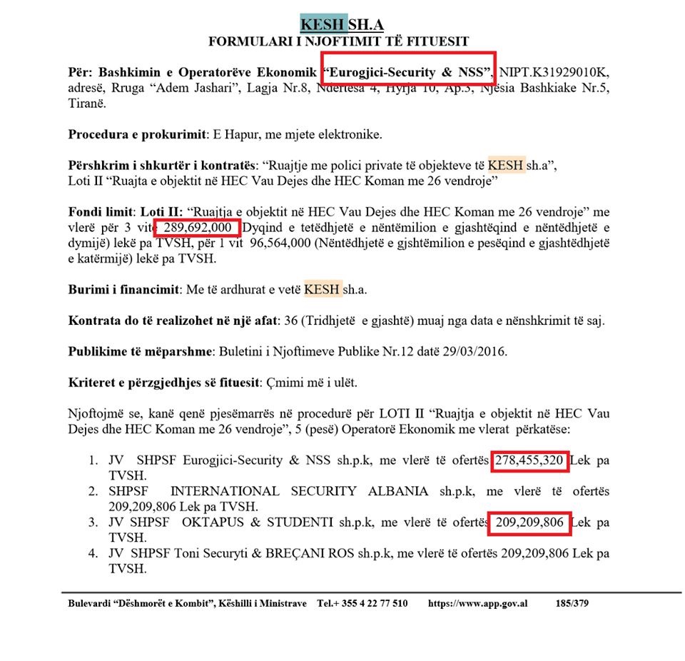 Lotin e dytë, “Ruajta e objektit në HEC Vau Dejes dhe HEC Koman me 26 vendroje”, me fond limit 2.89 mld lekë, e fitoi po prapë i njëjti bashkim operatorësh, kësaj herë me diferencë 690 mln lekë më ofertën më të ulët.