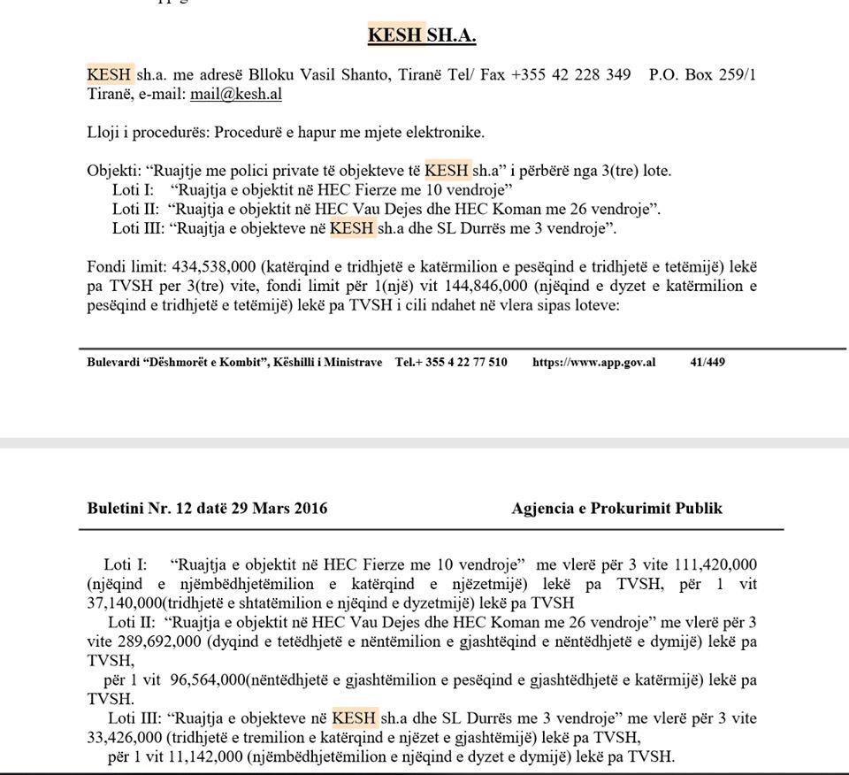 Në mars të vitit 2016, KESH sh.a zhvilloi procedurën për ruajtje në tre lote ( 1. HEC Fierzë, 2. HEC Vau i Dejës dhe Hec Koman dhe 3. KESH sh.a dhe SL Durrës) për tre vjet.