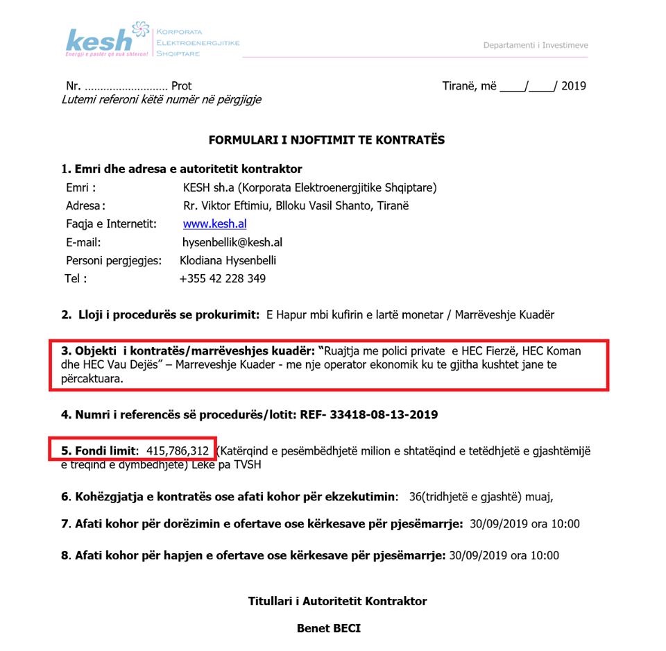 Në datë 13 gusht 2019 është shpallur procedura me të njëjtin objekt, por kësaj herë jo më i ndarë në lote: Ruajtja me polici private e HEC Fierzë, HEC Koman dhe HEC Vau Dejës”, me fond limit 4,15 mld lekë dhe kohëzgjatje 3-vjeçare.