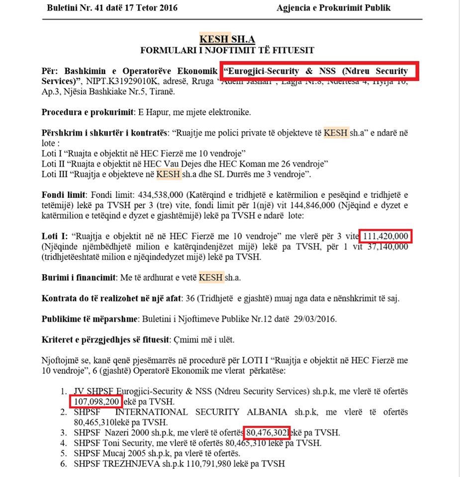 Lotin e parë, “Ruajta e objektit në HEC Fierzë me 10 vendroje” me fond limit 1.11 mld lekë, e fitoi bashkimi i operatorëve Eurogjici & Ndreu (N.S.S), si oferta më e lartë me 260 mln lekë diferencë me ofertën më të ulët.