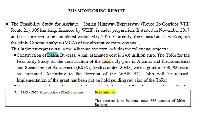 By Pass–i i Lezhës që u shndërrua në PPP-ne e famshme Milot-Balldren, sakaq ishte në shinat e ndërtimit. Kuadri i investimeve për Ballkanin Perëndimor që funksionon në kuadër të nismës së Berlinit kishte akorduar 350 mijë euro për studimin e ndikimit në mjedis të projektit teksa kishin përfunduar gjetjet paraprake të studimit të fisibilitetit.