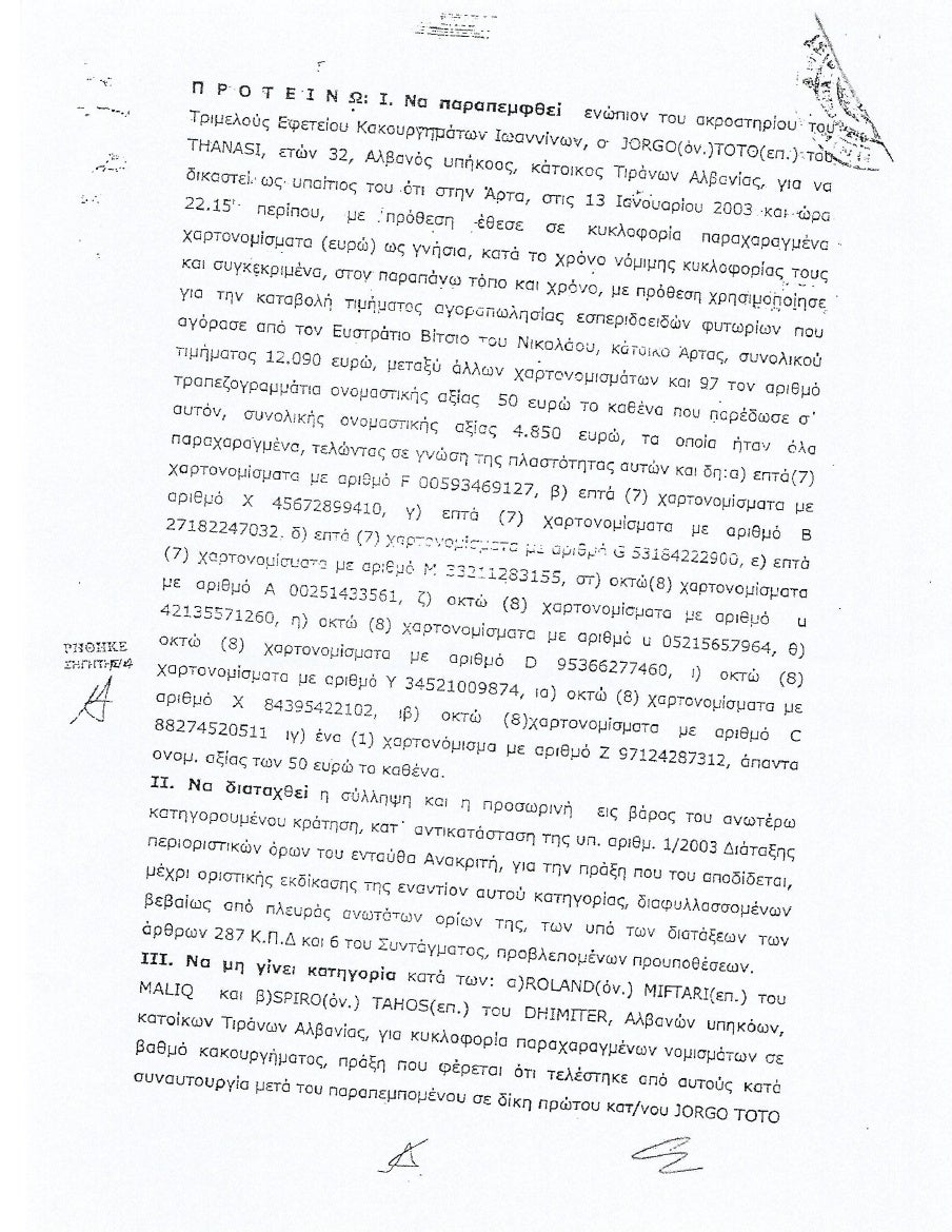 Me poshte eshte dokumenti i plote i Prokurorise dhe vendimi i Gjykates se Janines për të arrestuarin Agim Kajmaku ne vitin 2003 per krimin e përdorimit të parave të fallsifikuara, nën identitetin Jorgo Toto, me atesi Thanas dhe amesi Parashevi.