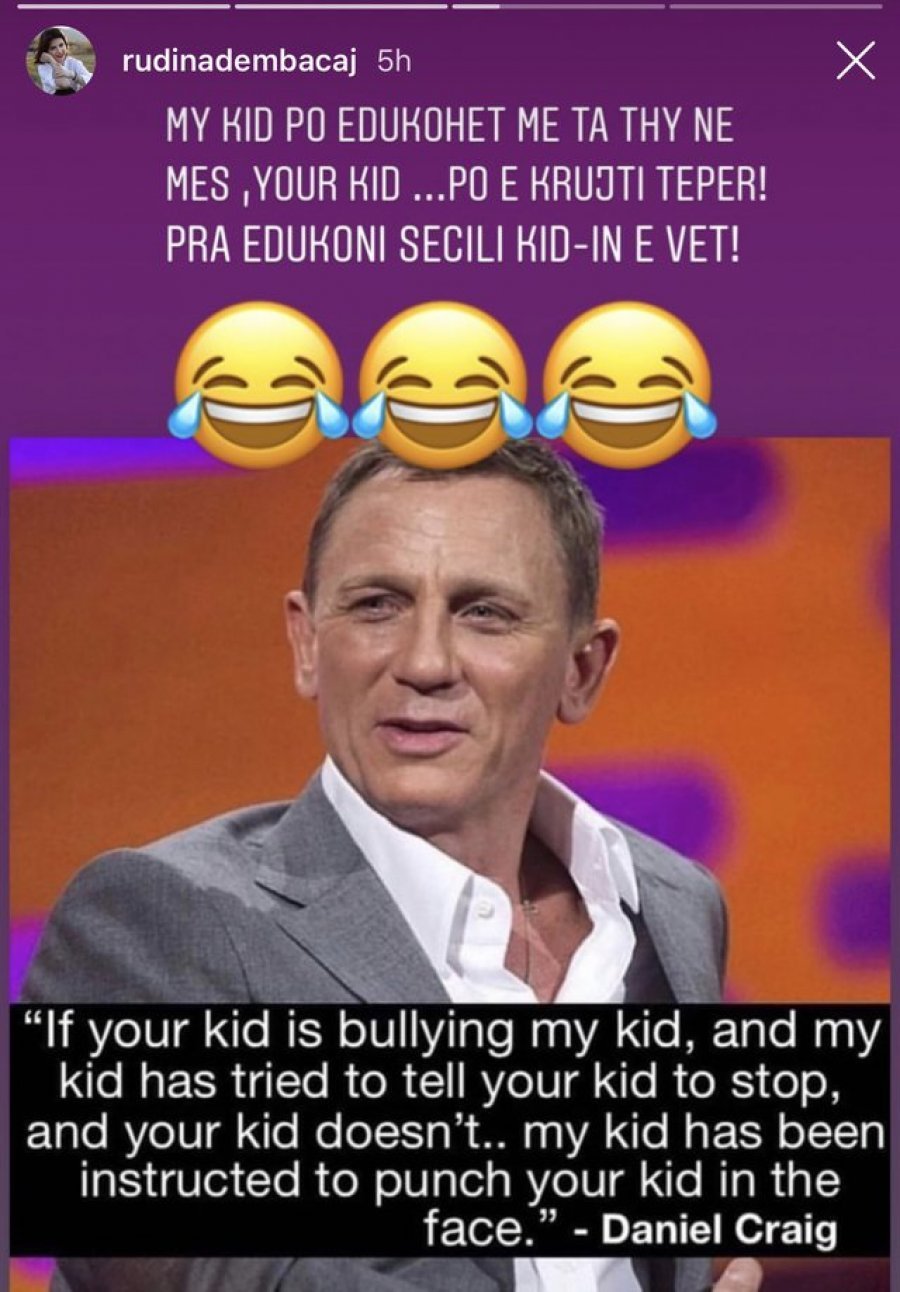Moderatorja ka publikuar një shprehje në Instgram ku duke se pajtohet me faktin që fëmijët e zgjidhin vet problemin me bullizimin.