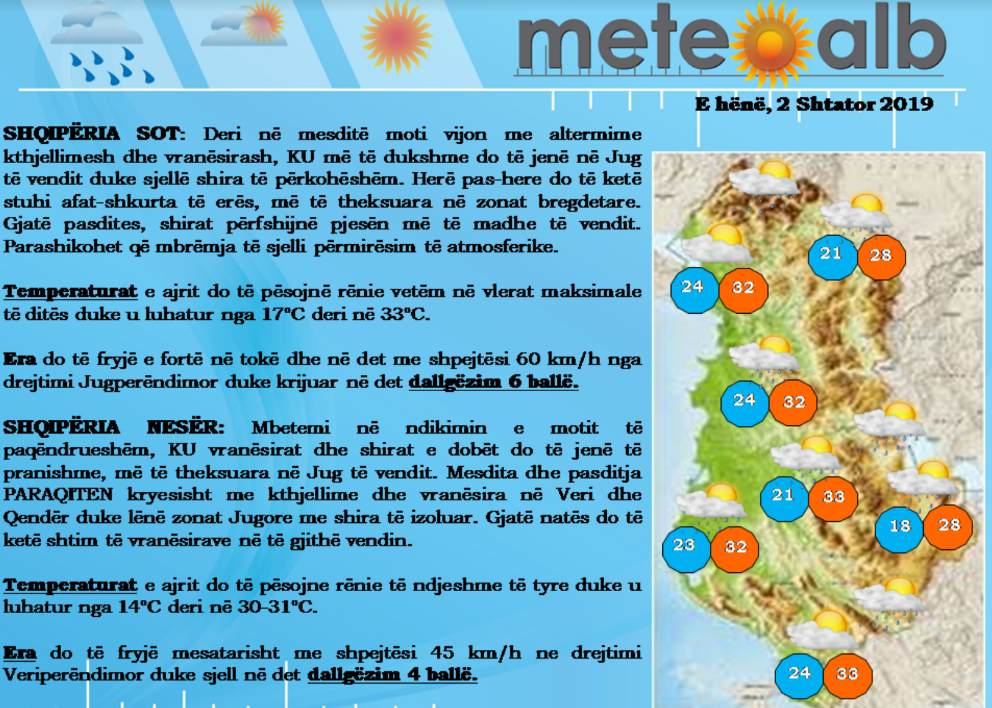 Parashikimi i motit për sot dhe nesër, datë 2 dhe 3 shtator, nga Meteoalb si më poshtë.