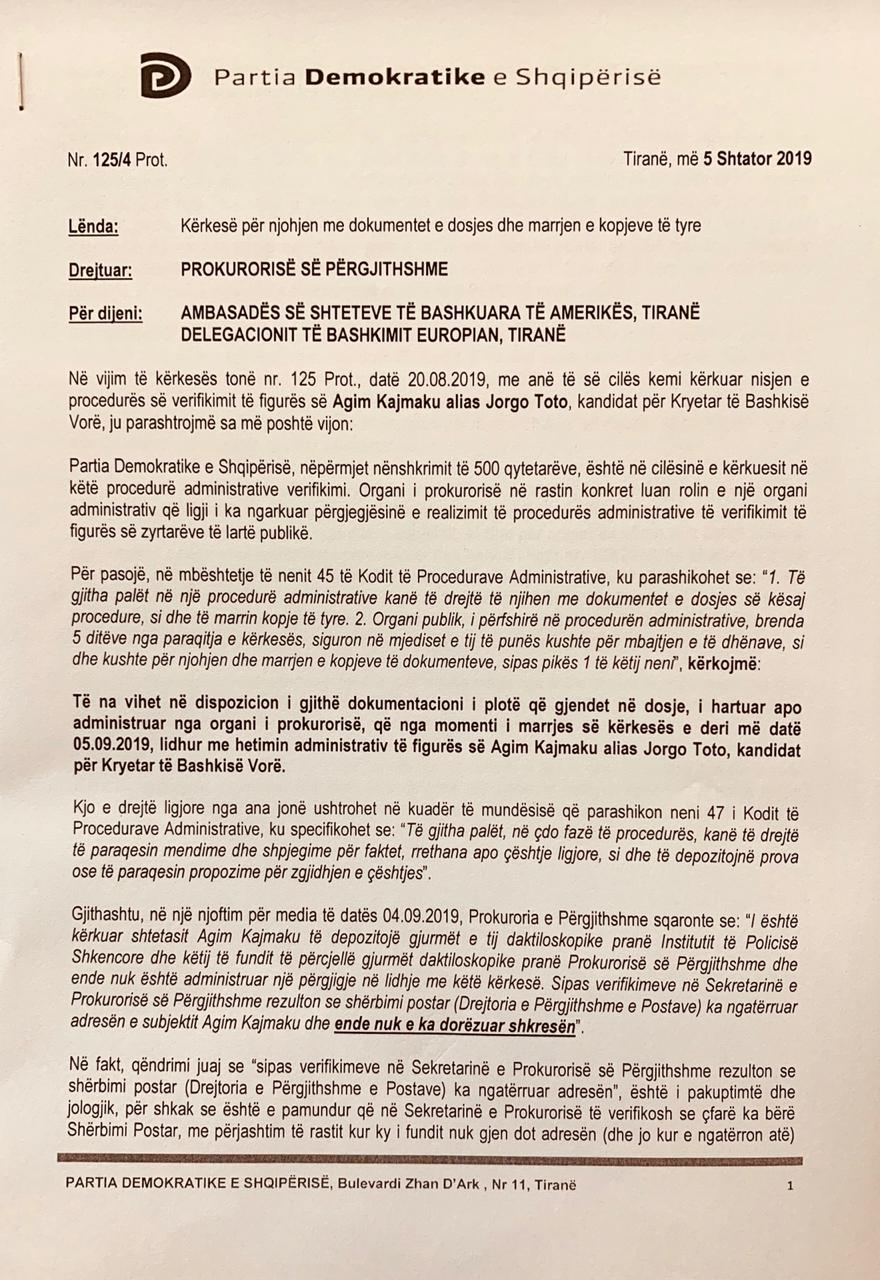 Partia Demokratike i kërkoi Prokurorisë dokumentacionin e plotë për çështjen e verifikimit të Agim Kajmakut, i arrestuar dhe i kërkuar në Greqi me emrin Jorgo Toto për një krim që dënohet me 10 vjet burg. Duke shfrytëzuar të drejtën që i jep ligji, Partia Demokratike kërkon të njihet me çdo veprim të prokurorisë që nga data e dorëzimit prej saj të kërkesës së verifikimit në 20 Gusht deri në 5 Shtator.