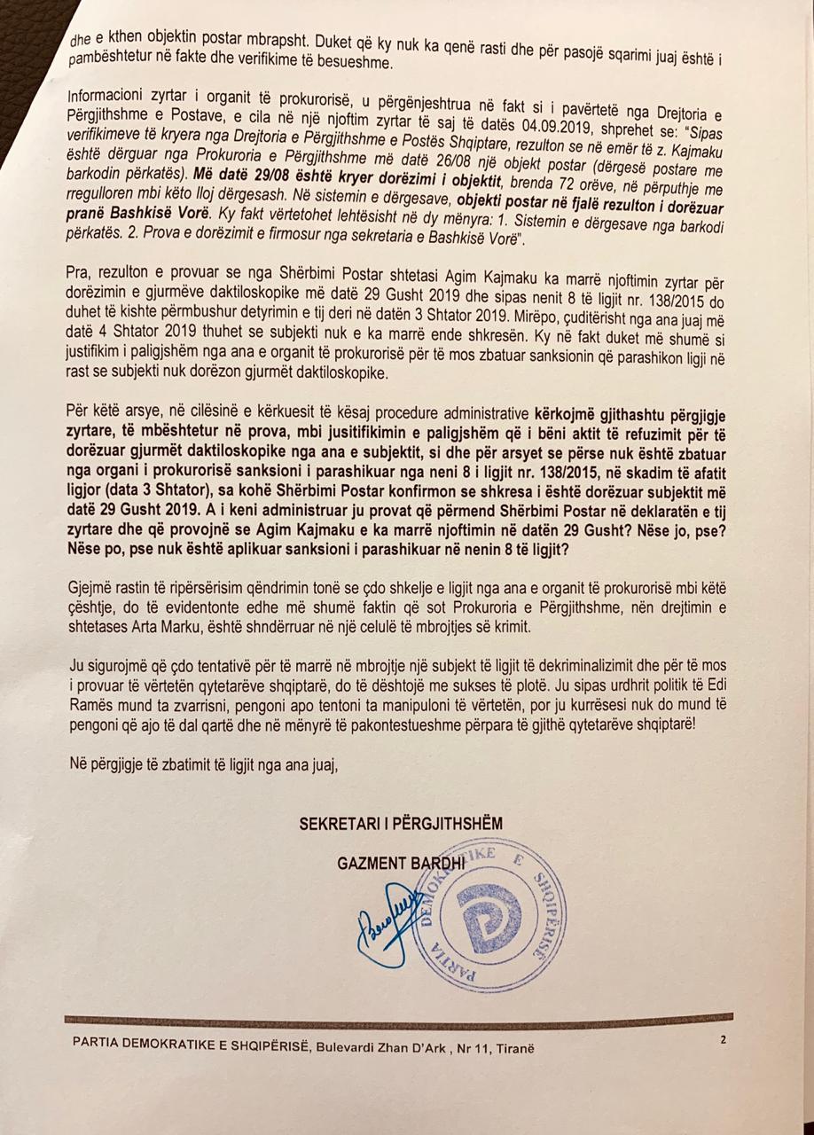 Letra e firmosur nga Sekretari i Përgjithshëm i PD, Gazment Bardhi, vë në dukje mashtrimin publik të prokurorisë për pretendimin se Agim Kajmaku nuk ka dorëzuar akoma gjurmët e gishtërinjve, përtej afatit 5 ditor të përcaktuar nga ligji, sepse, siç u shpreh prokuroria, “shërbimi postar ka ngatërruar adresën e tij dhe ende nuk ka dorëzuar shkresën.” Në letër theksohet përgënjeshtrimi i ardhur nga Posta Shqiptare, e cila konfirmoi se dokumenti i prokurorisë është dorëzuar në Bashkinë Vorë, fakt ky që, siç deklaroi Posta, vërtetohet lehtësisht në dy mënyra: