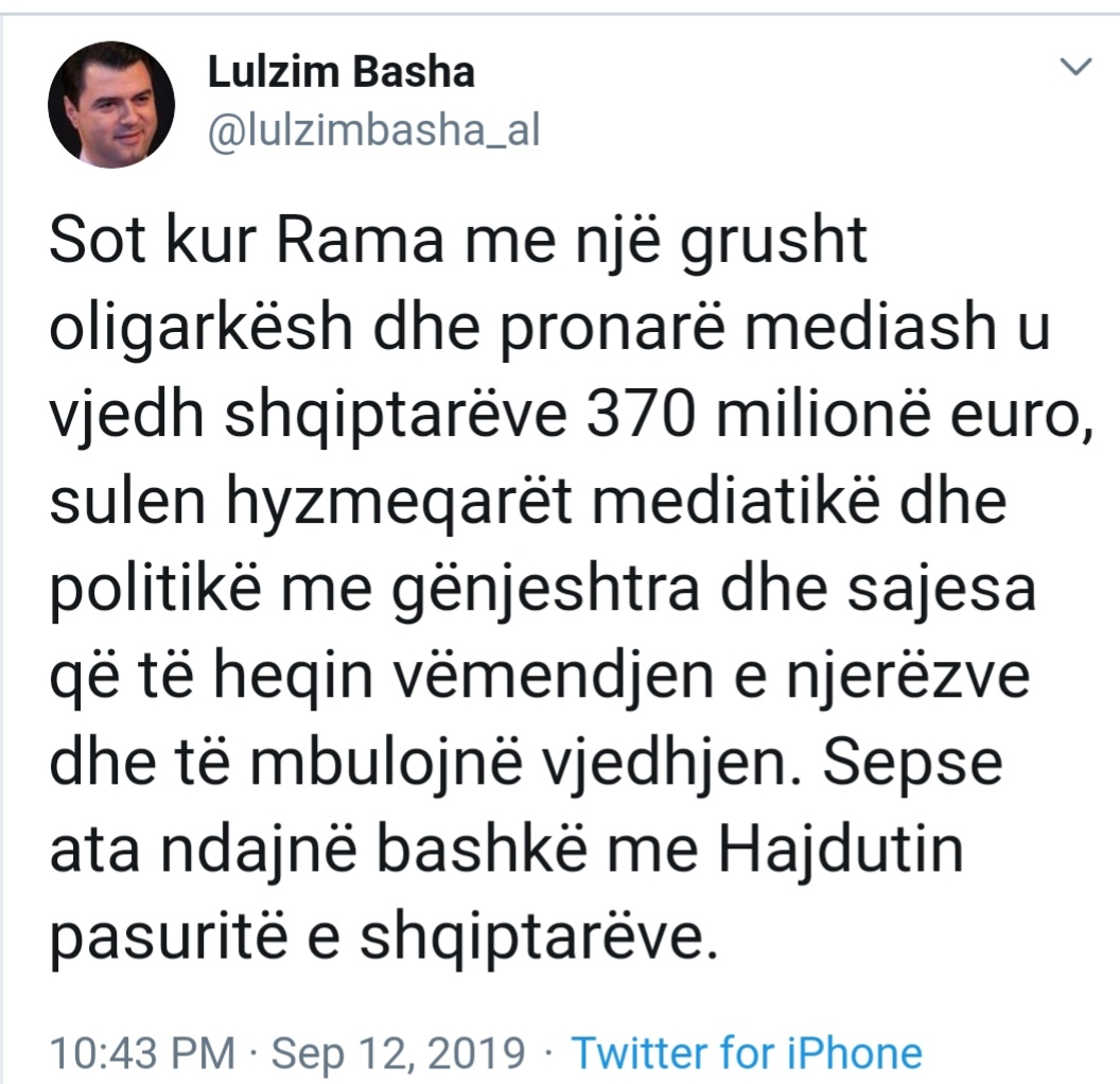 Basha ka postuar ne twitter duke konsideruar se oligarket dhe mediat e tyre po bejne gjithcka te shpelajne vemendjen.