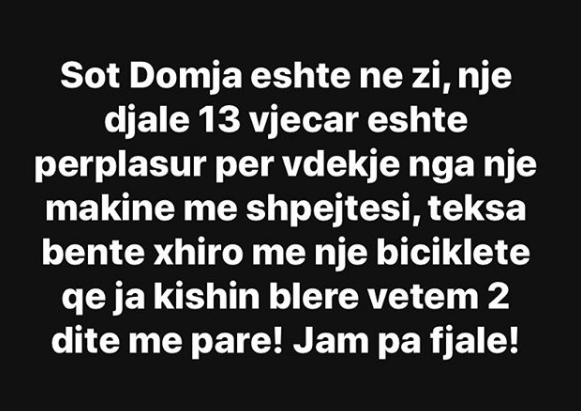 “Djali ka nderruar jete ne moment, dje rreth ores 10.30. Eshte derguar ne spital nga kalimtare, pasi makina eshte larguar, dhe prinderit e kane marre vesh ne mbasdite vone, duke menduar se femija ishte ne shkolle. Jam thellesisht e trishtuar, nuk gjej fjale ngushellimi! Por dua tju bej thirrje prinderve, mos ju jepni bicikleta femijeve ne kete vend te papergjegjshmish!”, shkruan dietologia.