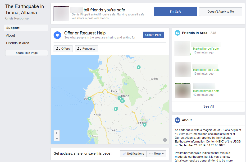 Pas tërmetit në Shqipëri, Facebook krijoi një grup ku i kërkonte përdoruesve të tregonin nëse janë të sigurtë.