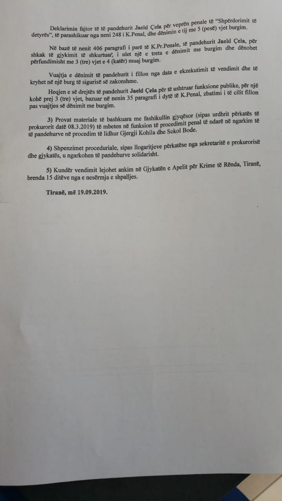 Deklarimin fajtor të të pandehurit Saimir Tahiri për veprën penale të “Shpërdorimit të detyrës”, të parashikuar nga neni 248 i K. Penal, dhe dënimin e tij me 5 (pesë) vjet burgim.