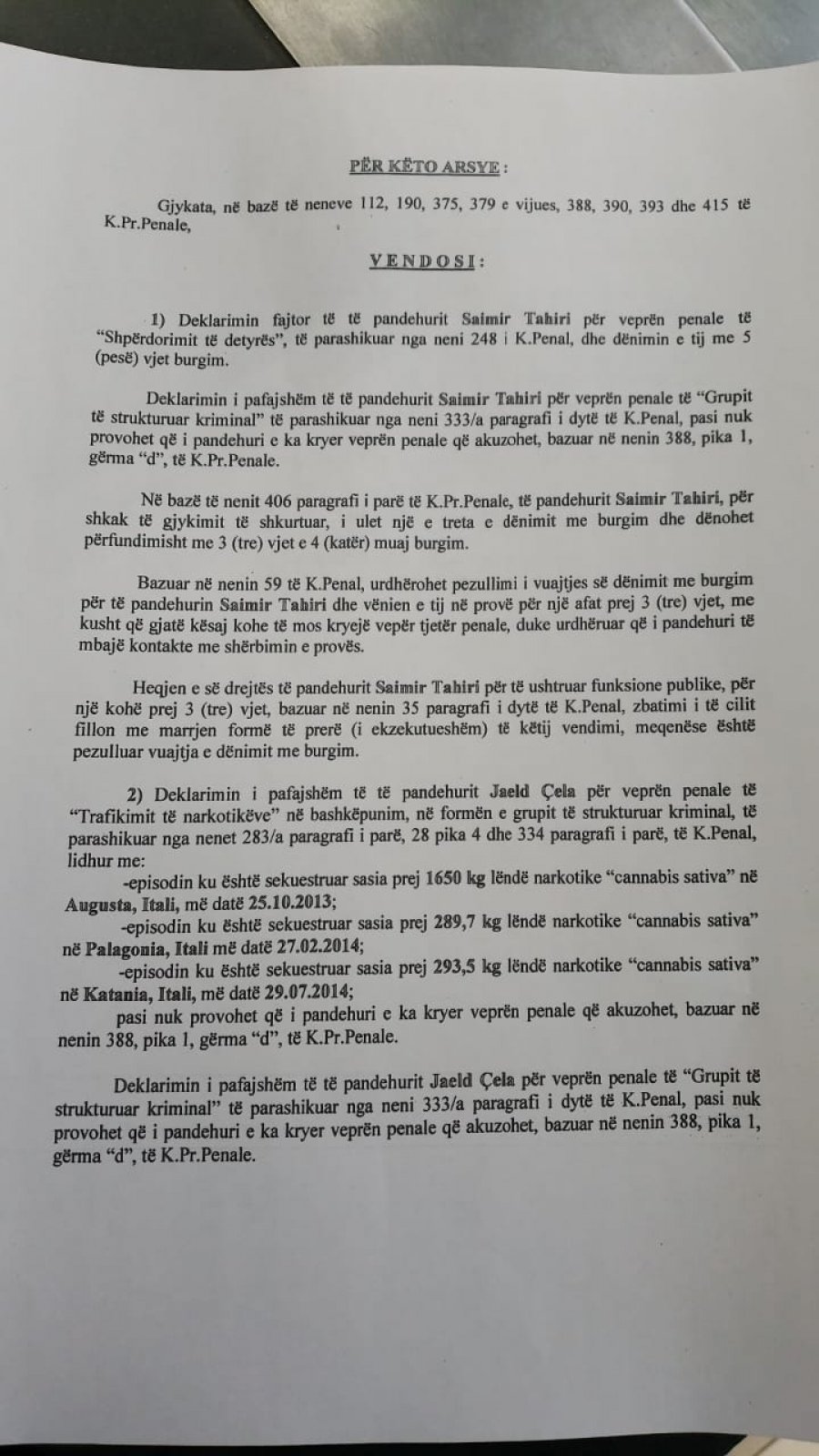 Vendimi i plotë i Gjykatës së Krimeve të Rënda për të pandehurin Saimir Tahiri