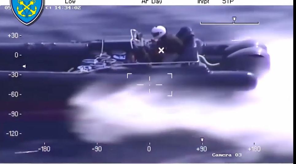 Pas një “lufte” të gjatë në ujërat greke mes policisë dhe trafikantëve, ku pati dhe shkëmbim zjarri, autoritetet greke ia dolën të rrethonin skafin super të shpejtë, duke arrestuar dy shtetas shqiptarë dhe nj italian. Siç shihet dhe në pamje, trafikantët shqiptarë kanë qenë të maskuar me skafandër dhe maska, ndërsa lëvizin me një shpejtësi të tmerrshme në det.
