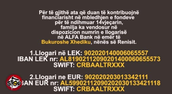 “Kam gjetur një spital në Turqi, në Ankara, shuma është shumë e madhe dhe unë nuk e përballoj dot. E kemi për 4 muaj dhe është 12 mijë euro në muaj. Gjendja e tij është kritike, përderisa as nuk shikon, as nuk lëviz dorë, as këmbë. Ushqehet me sondë, me shiringë nga hunda. Ai është ushqimi i Renisit. Lëngje frutash, nuk ka ushqim tjetër për Renisin. Ju lutem, po patët zemër dhe fëmijë më ndihmoni që t’i shpëtoj jetën Renisit, sepse është vetëm 14 vjeç. Do të jetojë edhe ai si shokët dhe si shoqet e veta”, thotë me dëshpërim nëna e 14-vjeçarit.