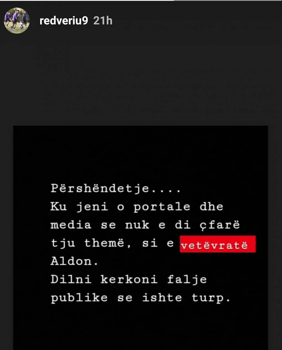 Në statusin e tij në Instagram, Redi Veriu, që është vëllai i të fejuarës së 24-vjeçarit Teqja, deklaron se të gjithë duhet t’i kërkojnë Aldo Teqjes, pasi ky i fundit ra nga kati i gjashtë dhe u raportua se ishte vetëhedhur pas një zënke me të fejuarën. “Përshëndetje! Ku jeni o portale dhe media, se nuk e di çfarë t’iu them… Si e vetëvratë Aldon? Dilni kërkoni falje publike se ishte turp”, shkruan Veriu.
