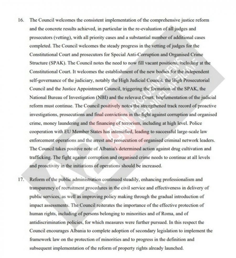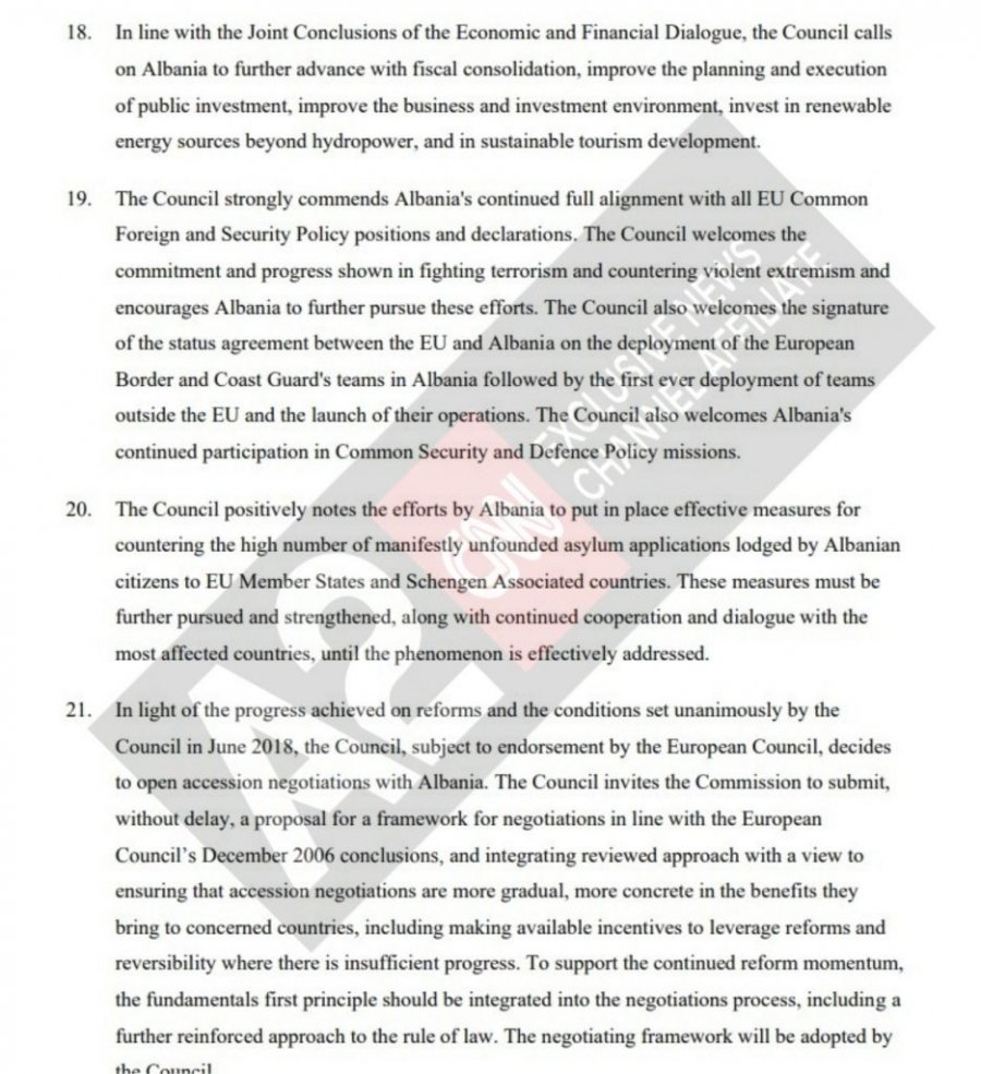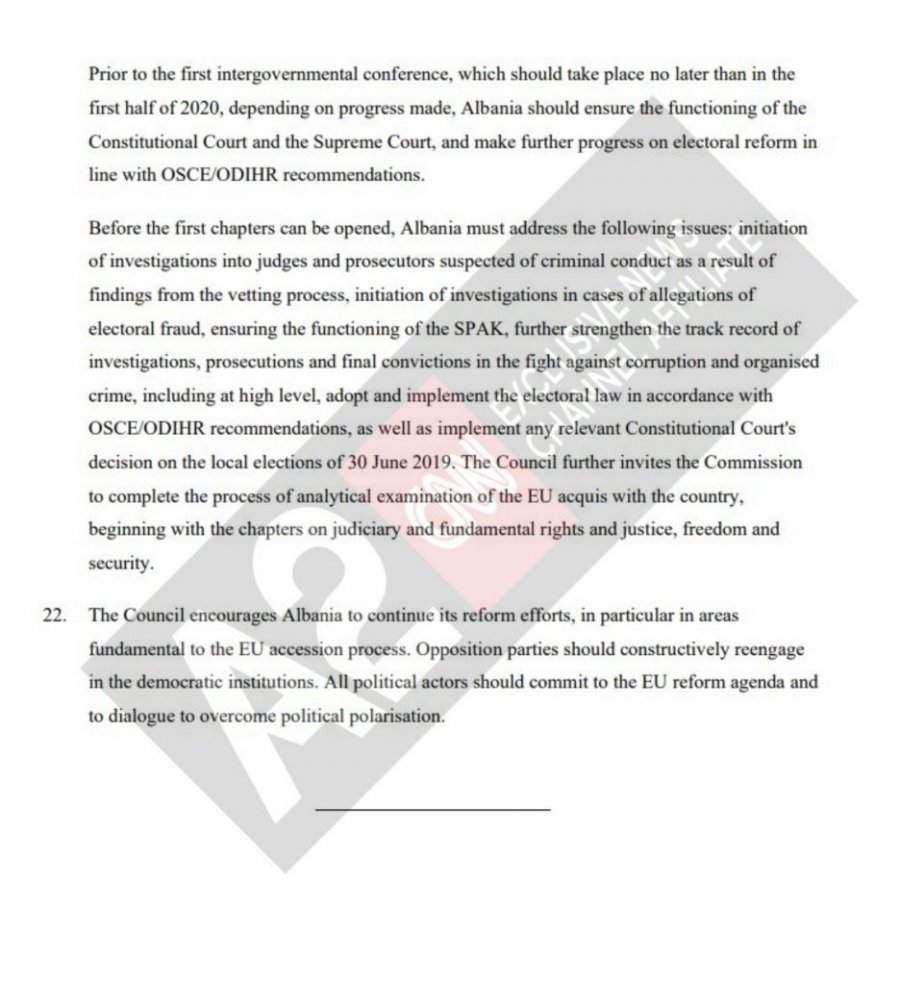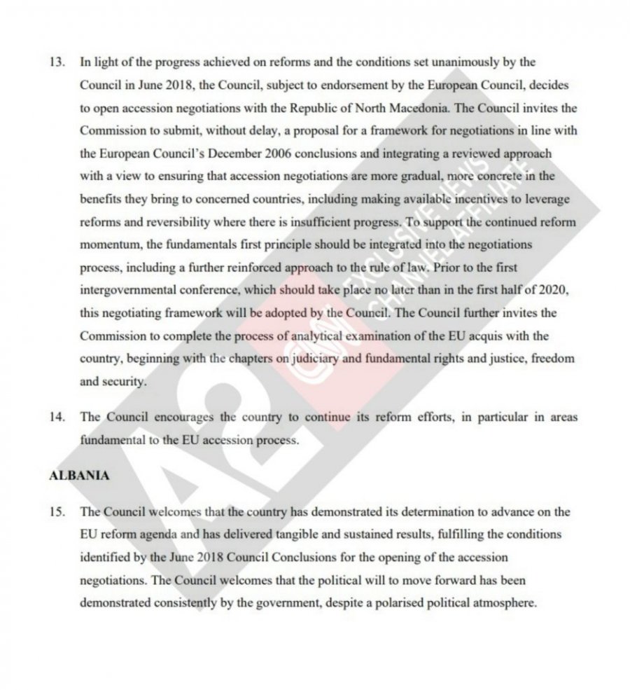 “Këshilli Europian vendos të hapë negociatat e pranimit me Shqipërinë. Para konferencës së parë ndërqeveritare, e cila duhet të zhvillohet jo më vonë se në gjysmën e parë të vitit 2020, në varësi të progresit të bërë, Shqipëria duhet të sigurojë: