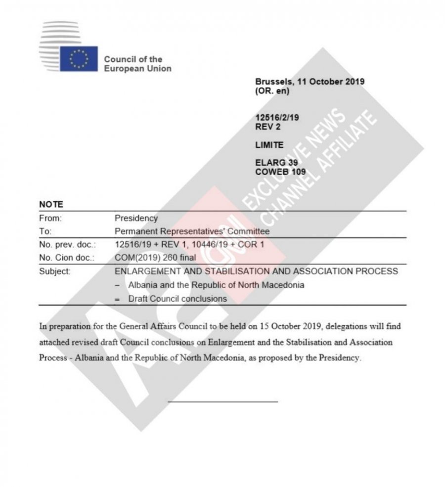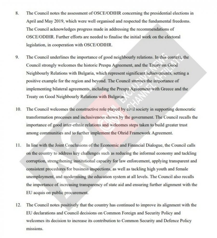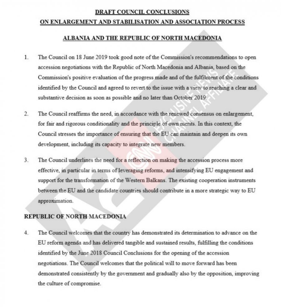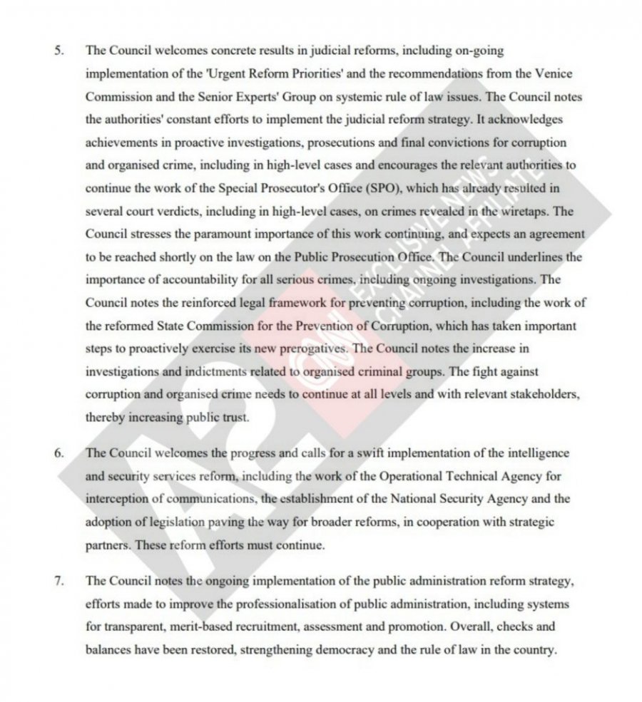 “Këshilli Europian vendos të hapë negociatat e pranimit me Shqipërinë. Para konferencës së parë ndërqeveritare, e cila duhet të zhvillohet jo më vonë se në gjysmën e parë të vitit 2020, në varësi të progresit të bërë, Shqipëria duhet të sigurojë: