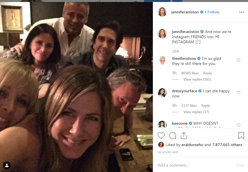 Fotoja me aktorët e serialit të famshëm“Friends”, i ka gëzuar pa masë fansat, pasi aludohet se ky serial mund të rikthehet. Matt LaBlanc, Courteney Cox, Matthew Perry, Lisa Kudroë dhe David Schëimmer, thyen rekorde shikueshmërie me serialin “Friends” dhe një rikthim i tyre do t’i gëzonte pa masë adhuruesit e tij. “Tani jemi edhe miq Istagrami. Përshëndejte Instagram”– shkruan aktorja e njohur.