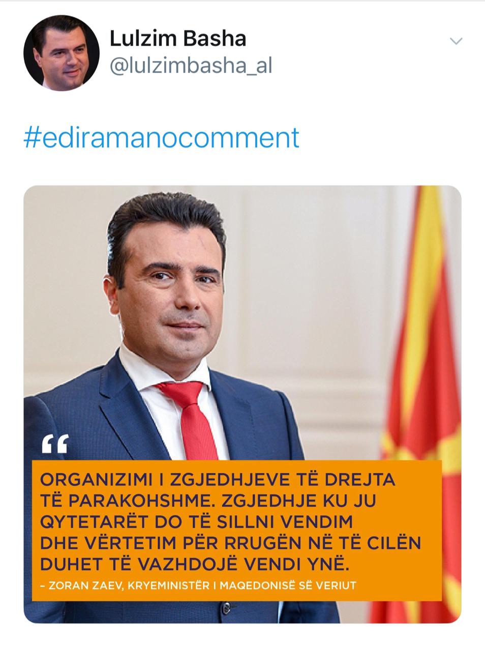 Kreu i opozitës nuk ndalet me citatet. Basha zgjedh deklaratën e kryeministrit Zaev për zgjedhje të parakohshme pas vendimit për te mos hapur negociatat dhe me ironinshkruan një tëitter vetëm me hashtagun #ediramanocomment.