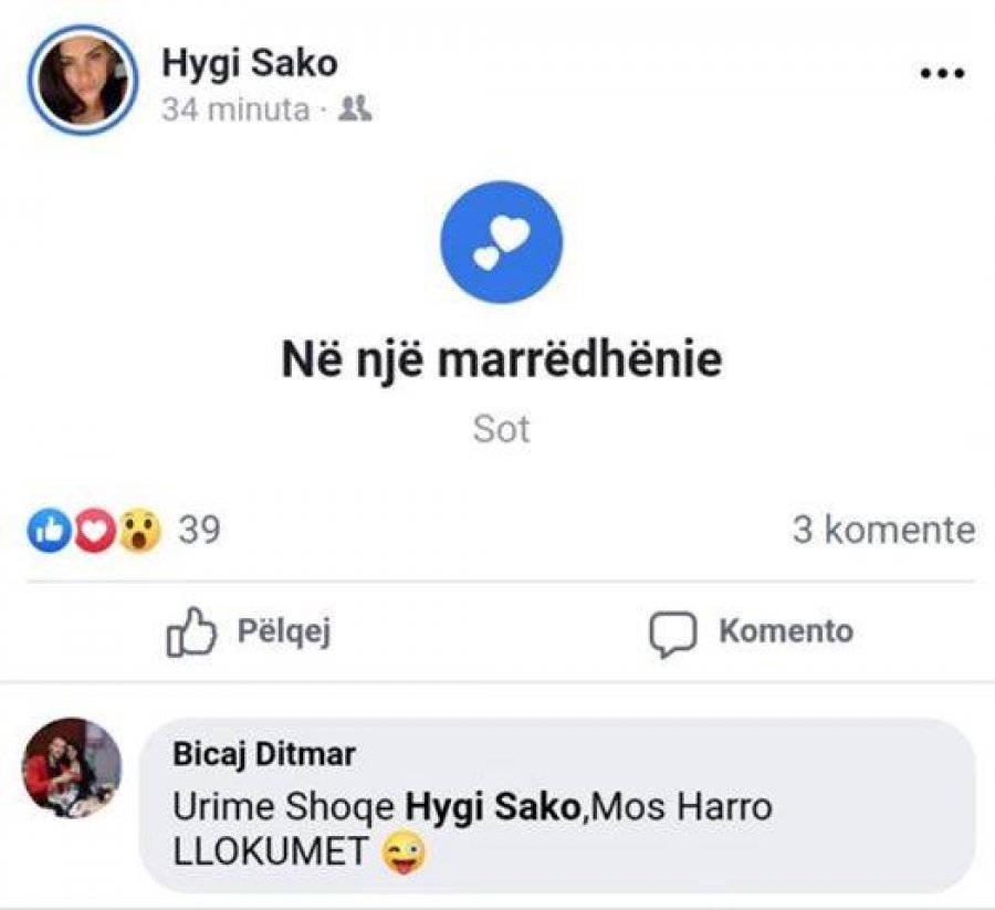 Moderatorja e emisioneve sportive, deklaroi vetëm pak kohë më parë se ishte beqare dhe ndihej mirë, por sot në Facebook ajo ka treguar se është në një marrëdhënie. Në një postim në Facebook, Sako shkruan se është në një marrëdhënie duke mos hezituar aspak ta ndajë me të tjerët.