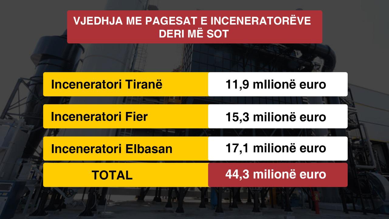 Akoma më i rëndë është fakti se këta inceneratorë, sipas kryeveprës së korrupsionit të Edi Ramës, paguhen miliona euro çdo vit, megjithëse nuk ekzistojnë. Në dy vjet, qeveria e Edi Ramës ka bërë 44.3 milionë euro pagesa për inceneratorët fantazmë, një vjedhje ditën për diell e shqiptarëve. Nga të dhënat e thesarit rezulton se pagesat e kryera deri tani për çdo incenerator janë si më poshtë: