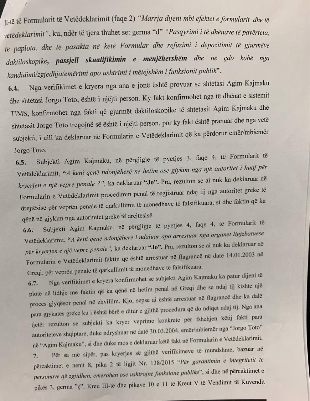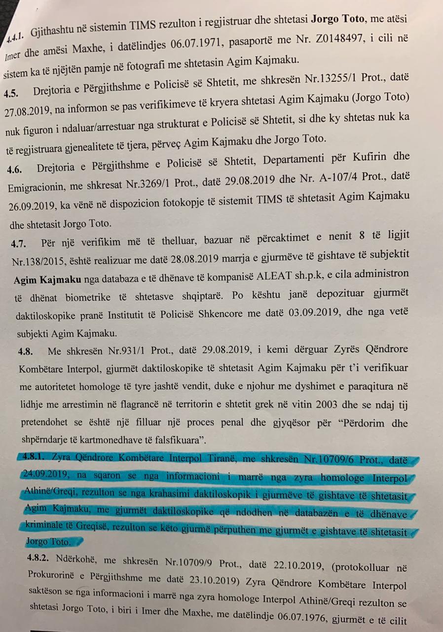 Në vendimin e Prokurorisë i mbërritur vetëm pak minuta më parë zyrtarisht në Partinë Demokratike, rezulton se zyra Qendrore e Kombëtare e INTERPOL Tiranës, me shkresën Nr. 10709/6, datë 24/09/2019; ka sqaruar se nga informacioni i marrë nga zyra homologe INTERPOL Athinë rezulton se nga krahasimi i gjurmëve të gishtërinjve të shtetasit Agim Kajmaku, me gjurmët e gishtërinjve që ndodhen në databazen e të dhënave kriminale në Greqi ka përputhshmëri të plotë me ato të shtetasit Jorgo Toto.