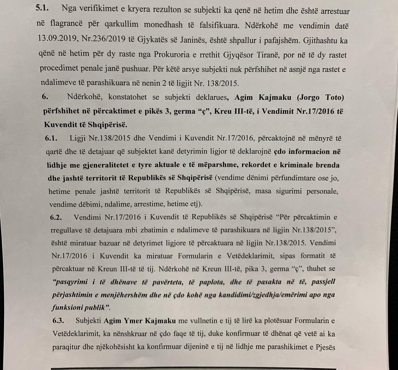 Në konkluzion, organi i prokurorisë ka konfirmuar se shtetasi Agim Ymer Kajmaku, kandidati i Edi Ramës për bashkinë Vorë, përfshihet në përcaktimin e pikës 3, germa ç, kreu 3, të vendimit 17-2016-të të Kuvendit të Shqipërisë.