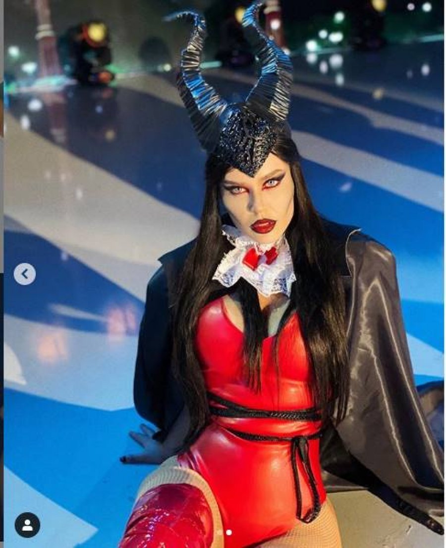 Paruket e zeza veshja dhe make up i errët i kanë dhënë modeles pamjen tipike të Maleficentit, ndërsa modelja gëzon linja perfekte dhe të admirueshme.