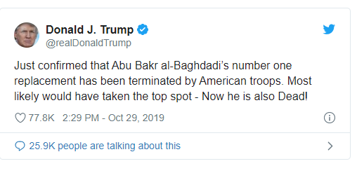 Në një postim në llogarinë e tij zyrtare në ‘Twitter”, Trump shkruan se zëvendësuesi, Abdullah Qardash, një ish-oficer i Sadam Hussein, u vra nga trupat amerikane.