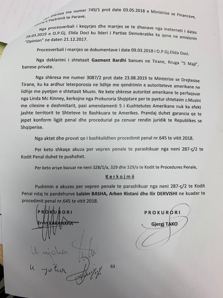 Gjithashtu hetimet janë mbyllur edhe ndaj ish-sekretarit të përgjithshëm, Arben Ristani dhe shefit të financës Ilir Dervishi, ndërsa dosja është dërguar në gjykatë po për të njëjtën akuzë.