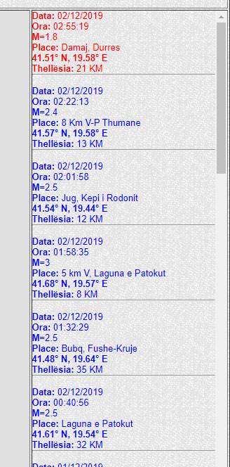 Sipas IGJEUM, lekundja me e fundit e regjistruar eshte ajo e ores 02:55 me epiqender ne Damaj te Durresit, ne thellesi 21 km dhe me magnitude 1.8.