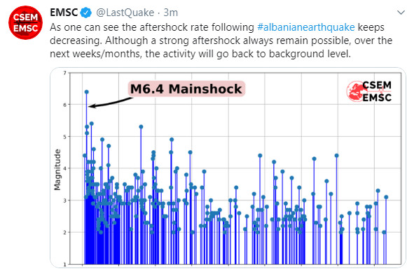 “Siç mund ta shohim, vala e pasgoditjeve të tërmetit që goditi Shqipërinë po vjen duke u shuar. Edhe pse një pasgoditje e fortë është gjithmonë e mundshme përgjatë javëve dhe muajve që pasojnë, aktiviteti do të rikthehet në nivelin normal”, është postimi në Twitter i Qendrës Sizmologjike Europiane-Mesdhetare.