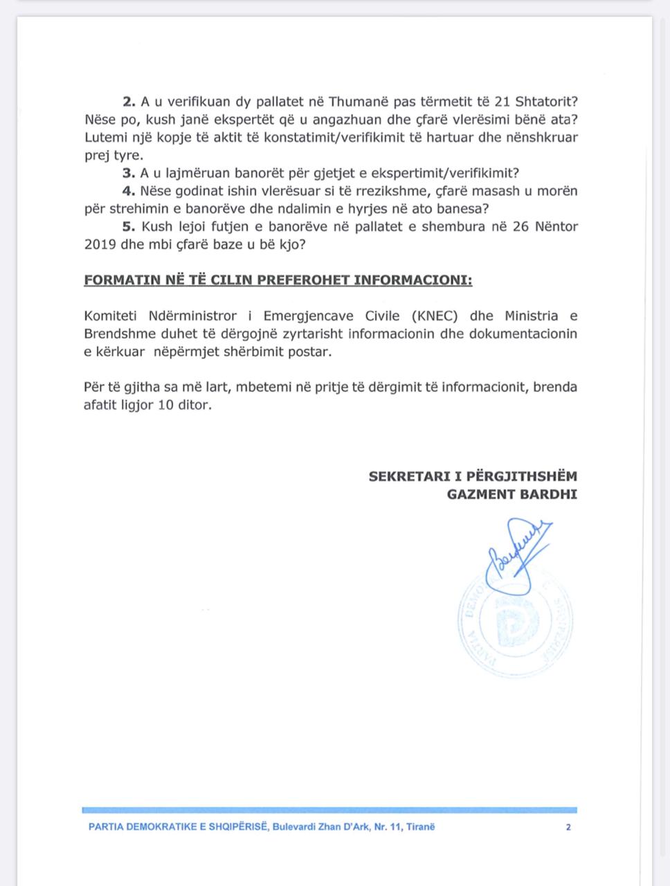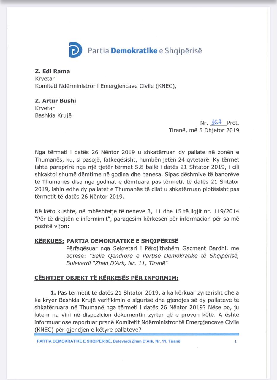 1. Pas tërmetit të datës 21 Shtator 2019, a ka kërkuar zyrtarisht dhe a ka kryer Bashkia Krujë verifikimin e sigurisë dhe gjendjes së dy pallateve të shkatërruara në Thumanë nga tërmeti i datës 26 Nëntor 2019? Nëse po, ju lutem na vini në dispozicion dokumentin zyrtar që e provon këtë. A është informuar ose raportuar pranë Komitetit Ndërministror të Emergjencave Civile (KNEC) për gjendjen e këtyre pallateve?