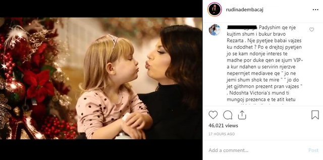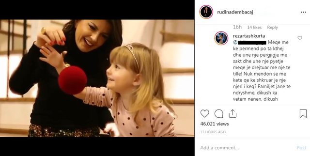“Meqe me ke permend po ta kthej dhe une nje pergjigje me sakt dhe une nje pyetje meqe je drejtuar me nje te tille! Nuk mendon se me kete qe ke shkruar je nje njeri i keq? Familjet jane te ndryshme, dikush ka vetem nenen, dikush babain, dikush te dy po jetojne ne shtepi te ndryshme dhe mund ti japin boten femijes, dikush jeton ne nje çati por jane te pa lumtur, e dikush keshtu e ashtu! Femijen nuk e ben te palumtur vendimi i prinderve, femijet i vrasin njerzit si puna jote, qe flasin, pergojojne, apo lene nje koment negativ ne nje video apo moment ku ka dashuri! Andaj mos u shqeteso per Rudinen , por shqetesohu per veten tende qe ke negativitet dhe kete e shpreh dhe ne nje koment publik. Nuk ta ka fajin as Rudina e askush tjeter qe e ke jeten aq bosh sa ke kohe te lesh koment tek nje njeri qe se njeh personalisht! Mere si keshille, mbush si fillim jeten tende, do transmetosh me shume miresi!”, shkruan Rezarta.