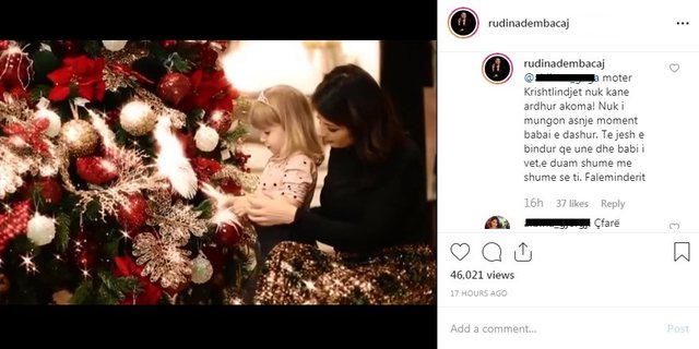 Komenti i ndjekëses: “Padyshim qe nje kujtim shum i bukur bravo Rezarta. Nje pyetje babai vajzes ku ndodhet? Po e drejtoj pyetjen jo se kam ndonje interes te madhe por duke qen se shume VIP-a kur ndahen u servirin njerzve nepermjet mediave qe “jo ne jemi shume shok te mire”, “jo do jet gjithmone prezent prane vajzes . Ndoshta Victorias mund ti mungoj prezenca e te atit ketu sepse Krishtlindje do te thote ndryshe familje, feste, gezim. Nuk dua te te gjykoj por as mund te pajtohem dot me idene ne ndahemi po ne jemi ketu per ty pra ne nuk jemi Amerikan”, shkruan ndjekësja së cilës Rudina nuk ia ka lënë mangët përgjigjen.