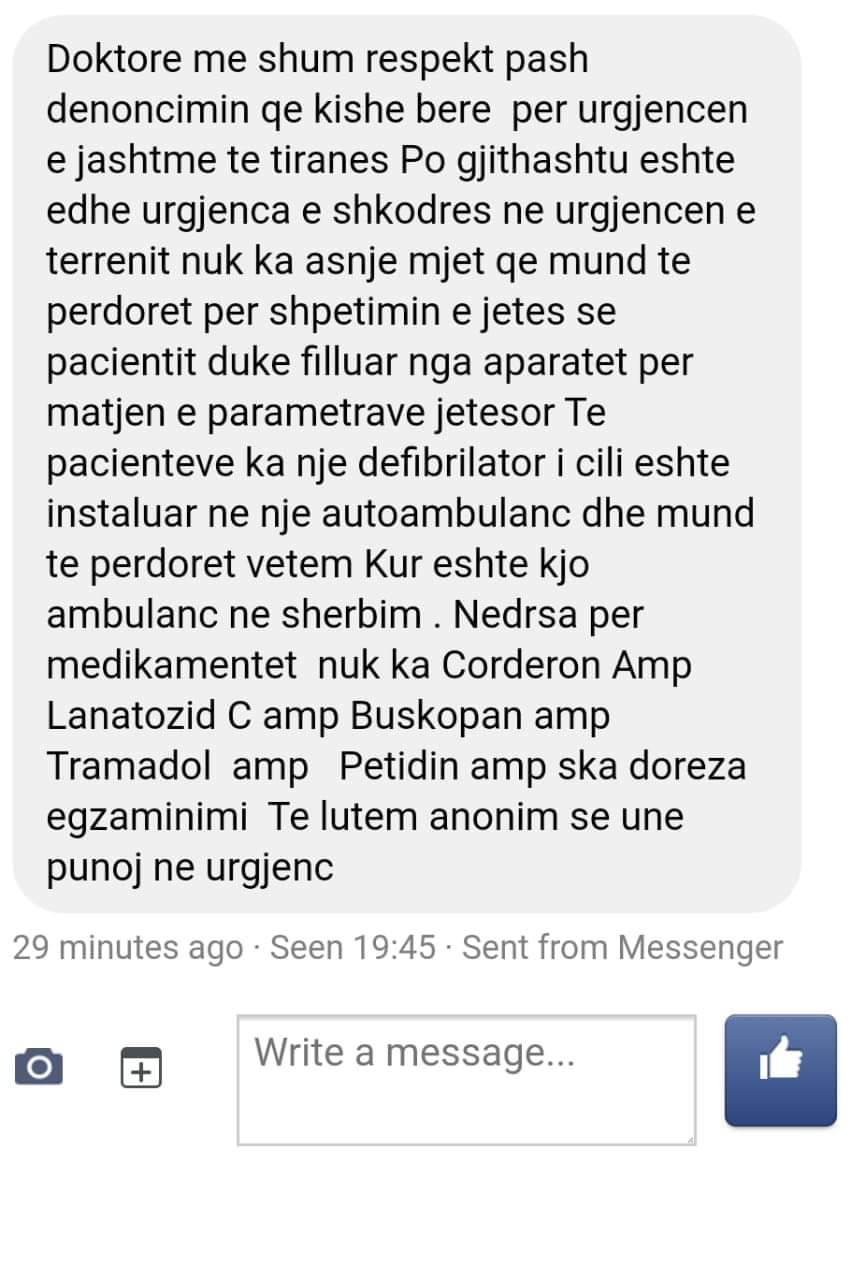 Situata e Urgjences se Tiranes nuk eshte rast i vecuar. Urgjenca e Shkodres ka te njejten situate me mungese ilacesh per ndihmen e shpejte. Pyetje per znj. ministre Ogerta Manastirliu: o zonje, cfare ben pjesen tjeter te kohes kur nuk del ne ERTV?