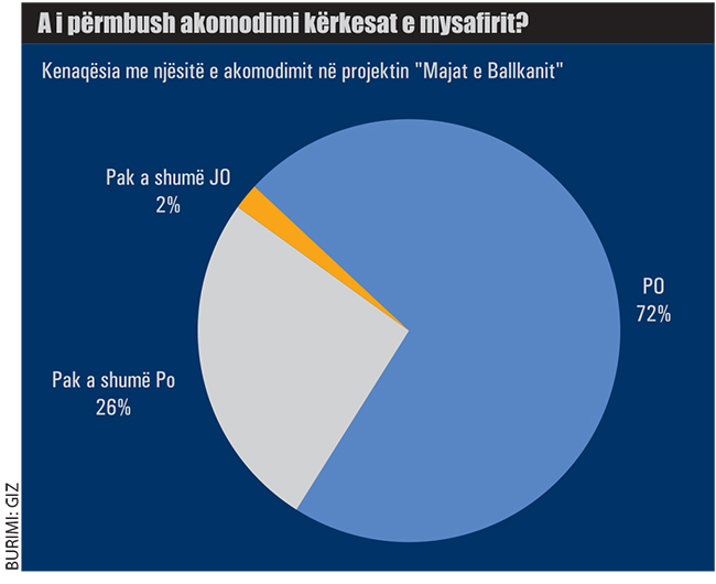 Pothuajse të gjithë turistët e huaj të pyetur (98%) që kanë qëndruar në bujtinat e lidhura me “Majat e Ballkanit” përgjigjen se janë të kënaqur me akomodimin (“Po” dhe “pak a shumë Po”).