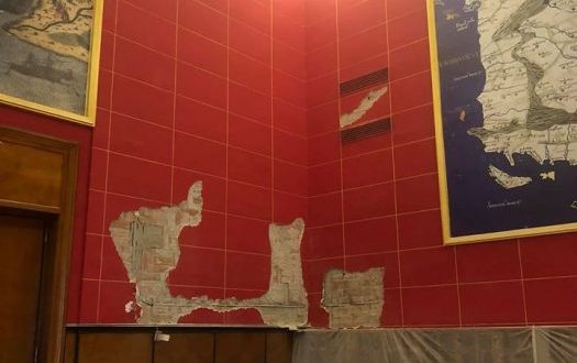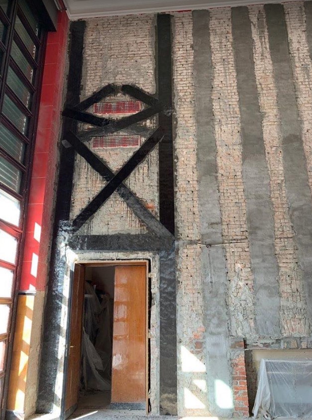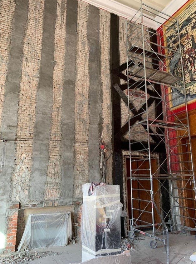 “Kryeministria gjithashtu u troshit nga tërmeti i dt. 26.11.19, dhe në sallën dopio-volum të hartave strukturat mbajtëse pësuan mjaft plasaritje. Ishte fat i madh që pikërisht parvjet të dy katet e poshtme – përfshi bazamentin – u përforcuan në pikëpamje konstruktive dhe u sollën në norme sizmike duke shpëtuar me siguri qëndrueshmërinë e objektit. Tani kjo sallë e bukur, me karakter të theksuar monumental, po i nënshtrohet rehabilitimit dhe përforcimit me fibra karboni. (Foto e pare: gjendja pas tërmetit; dy fotot e tjera: ndërhyrja konstruktive me fibra karboni) ”, shkruan Shkreli.