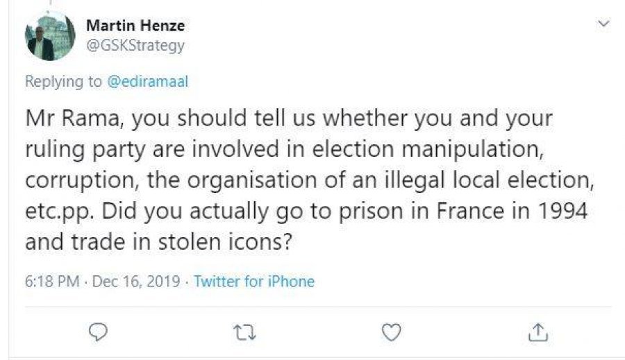 Ditën e djeshme Martin Henze, këshilltar për çështjet ekonomike pranë partisë së kancelares gjermane Angela Merkel, CDU, nëpërmjet një postim në Twitter, i ka bërë një pyetje të thjeshtë kryeministrit të Shqipërisë Edi Rama: A keni qene ne burg ne vitin 1994 ne France per vjedhje ikonash.