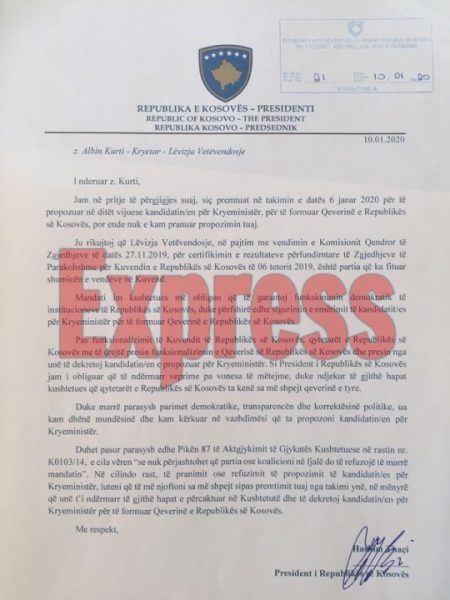 Në letrën e tij Thaçi i ka kërkuar Kurtit që ta njoftojë nëse VV-ja do të dorëzojë emrin e mandatarit për kryeministër apo nëse do të refuzojë ta bëjë një gjë të tillë, në mënyrë që siç thekson letra e Thaçit, të vazhdohet me mandatimin e dikujt tjetër, siç përmend pikën 87 të Aktgjykimit të Gjykatës Kushtetuese.