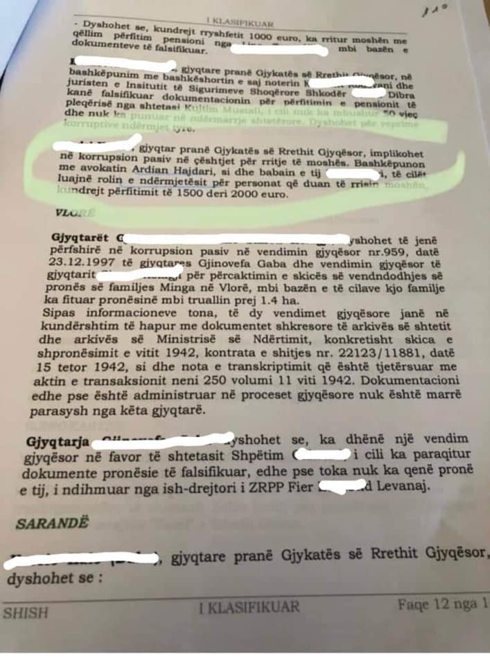 Ne mesin e emrave te gjyqtareve, SHISH rendit edhe nje rast ne Shkoder ku nje gjyqtar bashkepunonte ne afera korruptive me avokatin ARDIAN HAJDARI tashme me detyren e gjyqtarit prane Kolegjit te Posaçem te Apelimit! Ne ate kohe SHISH rendit se gjyqtari ne bashkepunim me avokatin HAJDARI me cilesine e ndermjetesit (sekserit) perfiton nga 1500 deri 2000 euro per rastet ku personat kerkonin te rrisin moshen per te perfituar pensionin nga shteti! Pra qe ne ate kohe SHISH kishte informacion dhe te dhena per aferat e mundshme korruptive te avokatit HAJDARI i cili cuditerisht kaloi me suksese Vetingun pasi DSIK-ja prane qeverise e nxori te paster!