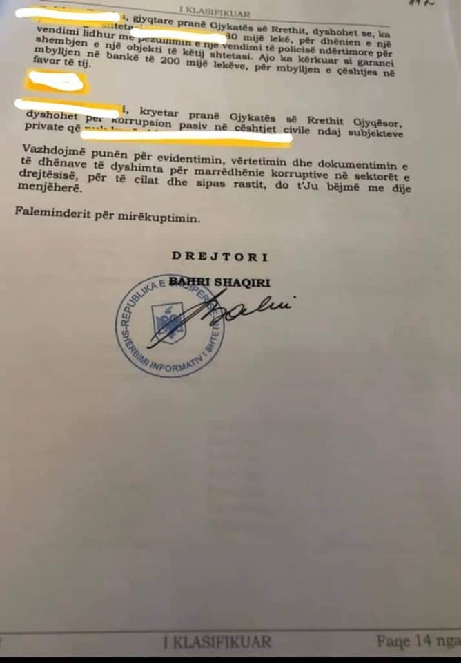 Drejtoria e Sigurimit te Informacionit te Klasifikuar fshehu te dhenat per gjyqtarin e Kolegjit te Posaçem te Apelimit Ardian Hajdari! Me posht po publikoj nje relacion te Sherbimit Informative Shteteror qe mban daten e 22 dhjetor 2006 te firmosur nga ish-kreu i SHISH-it Bahri Shaqiri! Ne kete relacion qe SHISH njofton Presidentin e Shqiperise te asaj kohe Alfred Moisiu per DYSHIMET dhe INFORMACIONET qe institucioni kishte per aferat korruptive te gjyqtareve te ndryshem te Shqiperise!