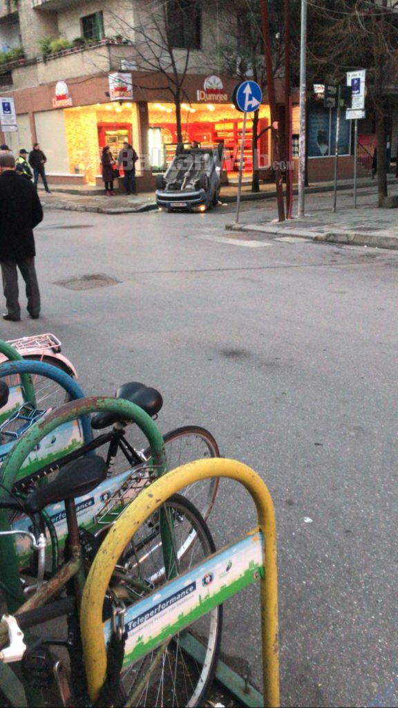 Një makinë është kthyer përmbys në mes të rrugës në kryeqytet. Ngjarja ka ndodhur pranë Fakultetit të Drejtësisë, ku mësohet se mjeti drejtohej nga një femër.