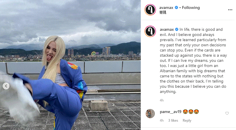 “Në jetë, ekziston e mira dhe e keqja. Dhe besoj se e mira mbizotëron gjithmonë. Kam mësuar veçanërisht nga e kaluara ime që vetëm vendimet e tua mund të të ndalojnë. Edhe nëse çdo gjë është grumbulluar kundër jush, ka një rrugëdalje. Nëse unë mund të jetoj ëndrrat e mia, edhe ju mundeni. Unë isha thjesht një vajzë e vogël nga një familje shqiptare me ëndrra të mëdha, që erdhën në SHBA, me asgjë tjetër përveç rrobave që kishin veshur. Unë po jua them këtë sepse besoj se dhe ju mund të bëni gjithçka.”,- shkruan Ava.