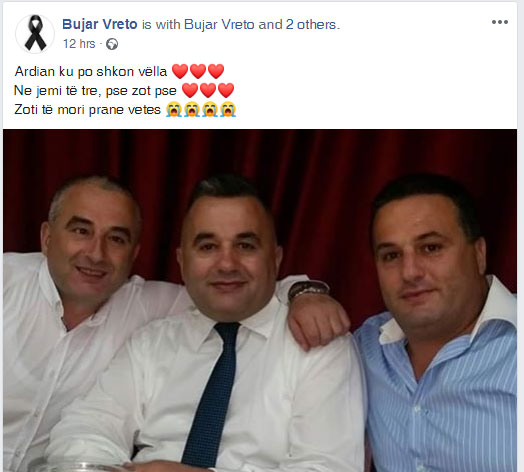 Përmes një mesazhi në ‘Facebook’ Vreto teksa ka publikuar një foto ku shihet bashkë me dy vëllezërit, një prej të cilëve humbi jetën dje, Ardiani, shkruan: Ardian ku po shkon vëlla. Ne jemi të tre, pse zot pse. Zoti të mori pranë vetes”.
