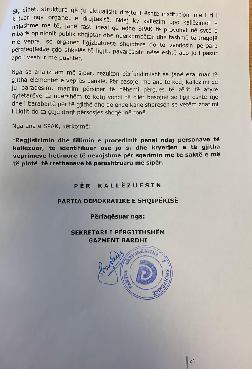 Duke kërkuar nga SPAK regjistrimin dhe fillimin e procedimit penal ndaj personave të kallëzuar, Partia Demokratike thekson se ky kallëzim është provë për SPAK që të dëshmojë se zbatimi i ligjit është i barabartë për të gjithë, pavarësisht pozitës shtetërore, duke i dhënë fund në këtë mënyrë pandëshkueshmërisë së zyrtarëve të lartë.