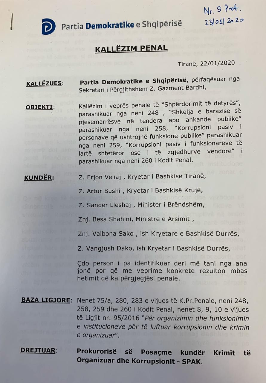 Partia Demokratike i është drejtuar Prokurorisë së Posaçme Antikorrupsion me një kallëzim penal lidhur me pasojat e tërmetit të 26 Nëntorit 2019. Erjon Veliaj, Sandër Lleshaj, Artur Bushi, Vangjush Dako, Valbona Sako dhe Besa Shahini, janë disa nga zyrtarët e lartë publikë të kallëzuar penalisht nga Partia Demokratike e Shqipërisë, për 5 vepra penale: